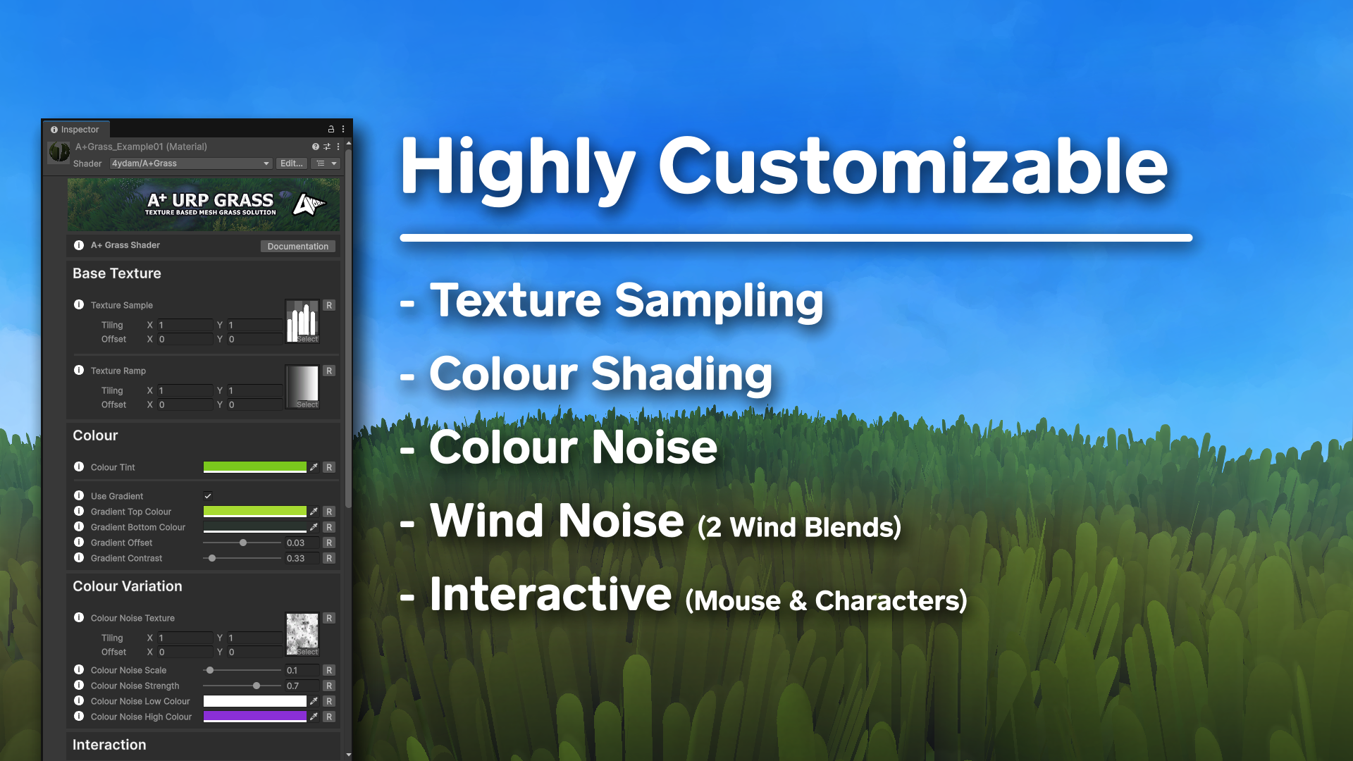 You will find 5 grass material presets set up as an example of what you can achieve with the A+ Grass shader. (This includes a ground material for each) They are all using a unique texture for the mesh sampling and rendering, included as part of the package. And also a simple grid material using a checker pattern.